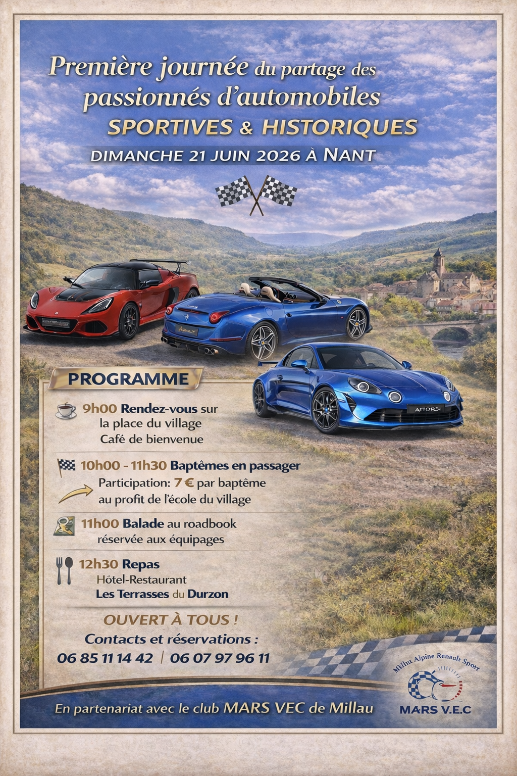 MARS V.E.C. est une association départementale régie par la loi du 1er juillet 1901 dont les statuts ont été déposés en préfecture de l'AVEYRON le 26 décembre 2013. Elle a pour but de promouvoir des balades touristiques, des épreuves de régularité en véhicules sportifs historique, salons, rassemblements, et diverses manifestations. Elle regroupe les possesseurs de voitures sportives d'époques à partir de 25 ans d'âge toute marques confondues ainsi que des voitures sportives d'exception